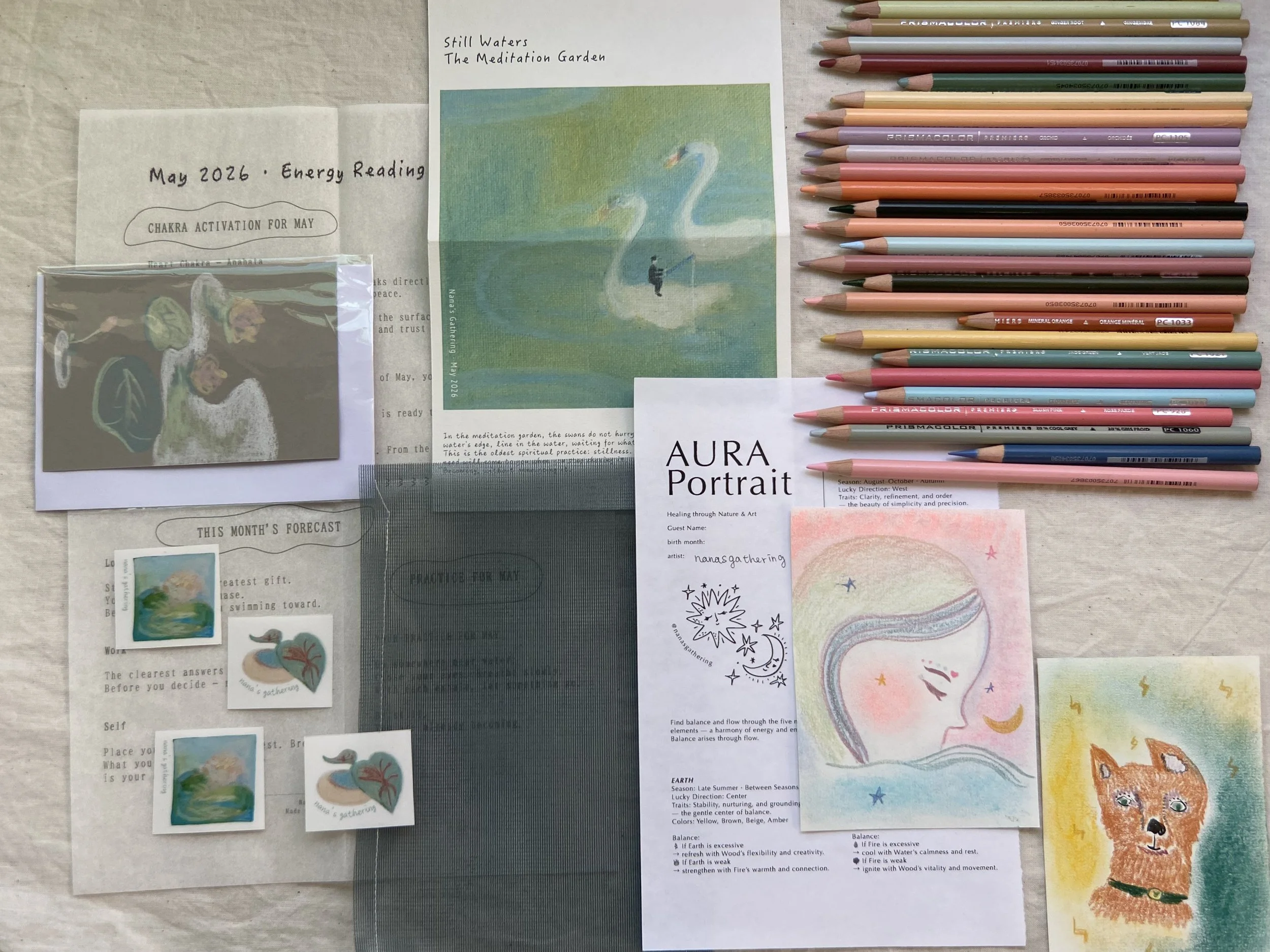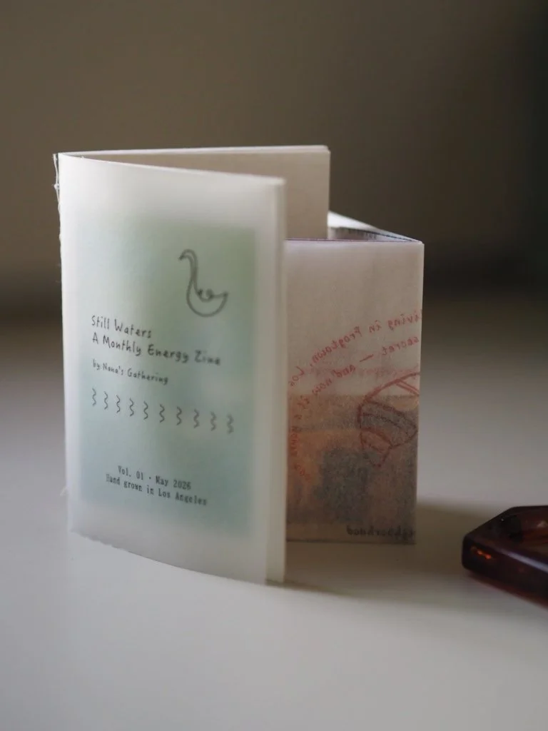 ✦ A hand-printed mini zine — Still Waters A small, palm-sized publication you can carry in your bag or keep on your shelf. Each issue weaves together the month's collective energy reading, Eastern astrology and the transition between zodiac seasons, chakra activation practice, guidance for love, work and self, a monthly ritual to carry with you, and a quiet zen story — a small parable to sit with. Something to return to throughout the month.